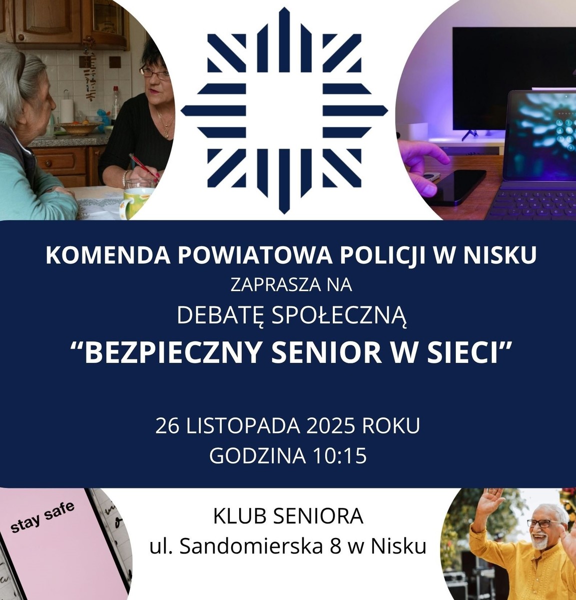 Komenda Powiatowa Policji w Nisku serdecznie zaprasza wszystkich seniorów na debatę społeczną, która odbędzie się 26 listopada 2025 roku o godzinie 10:15 w Klubie Seniora w Nisku przy ul. Sandomierskiej 8.