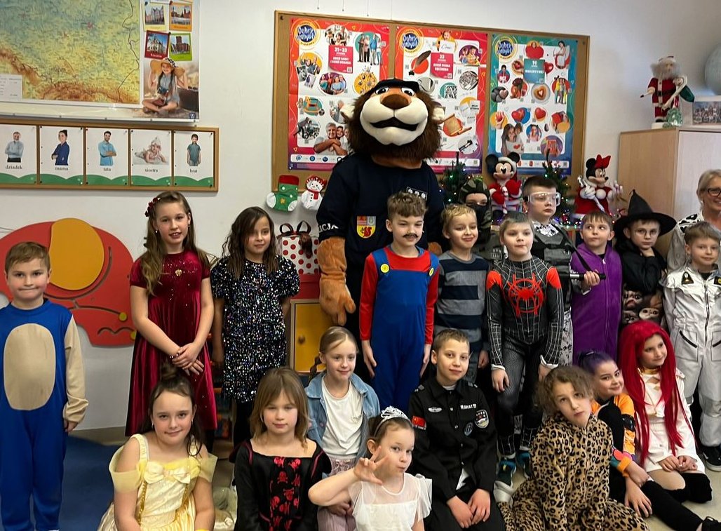 Komisarz Lew z wizytą u najmłodszych podczas zabawy karnawałowej