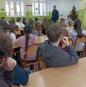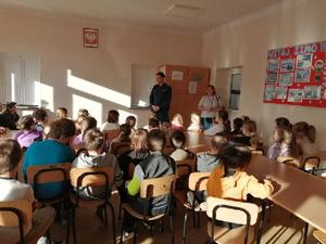 Mundurowi rozmawiali z uczniami na temat zagrożeń, jakie niosą ze sobą kontakty z nieznanymi osobami oraz jakie niebezpieczeństwa mogą czekać na nich w Internecie.