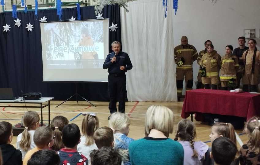 Strażacy omówili zagrożenia związane z zabawami na śniegu i lodzie, zwracając szczególna uwagę na wchodzenie na zamarznięte zbiorniki wodne. Prelegenci przybliżyli uczniom zasady postępowania w sytuacjach zagrożenia życia i zdrowia. Omówili jak prawidłowo wezwać pomoc. Dzieci miały okazję dowiedzieć się, jak ważna jest szybka i właściwa reakcja oraz współpraca ze służbami ratunkowymi.