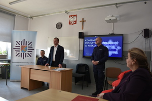 Zgromadzonych uczestników przywitała Dyrektor Publicznej Szkoły Podstawowej nr 1 im. Jana Pawała II w Rudniku nad Sanem - Lucyna Pizun. W spotkaniu uczestniczyli także Komendat Komisariatu Policji w Rudniku nad Sanem - podinspektor Witold Wilczyński, dzielnicowy podległego rejonu służbowego Komisariatu Policji w Rudniku nad Sanem - aspirant sztabowy Mariusz Hertman, p.o. Oficera prasowego Komendy Powiatowej Policji w Nisku - aspirant Rafał Puzio, Zastępca Burmistrza Gminy i Miasta Rudnik nad Sanem - Dariusz Świta, Kierownik Ośrodka Pomocy Społecznej w Rudniku nad Sanem - Agata Podolska-Sagan.
